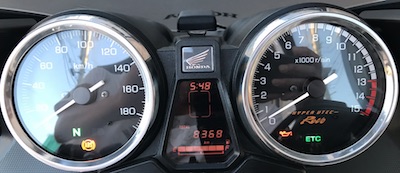 ハンドルにマウントしたので、CB400SBのフロント部分が映り込んでいます。